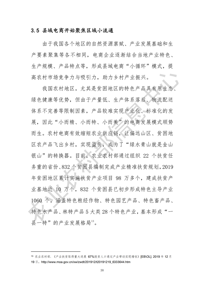 發(fā)布會指出,2019年全國2083個縣域網(wǎng)絡零售額達30961.6億元,同比增長23.5%,其中832個貧困縣網(wǎng)絡零售額達1076.1億元,同比增長31.2%;縣域農(nóng)產(chǎn)品網(wǎng)絡零售額達2693.1億元,同比增長28.5%,其中832個貧困縣農(nóng)產(chǎn)品網(wǎng)絡零售額為190.8億元,同比增長23.9%,需求側的數(shù)據(jù)、信息日益成為供給側結構性改革的新動能,農(nóng)業(yè)的產(chǎn)業(yè)鏈、供應鏈、創(chuàng)新鏈、價值鏈正在加速重構,電子商務成為“綠水青山就是金山銀山”的重要“轉換器”。