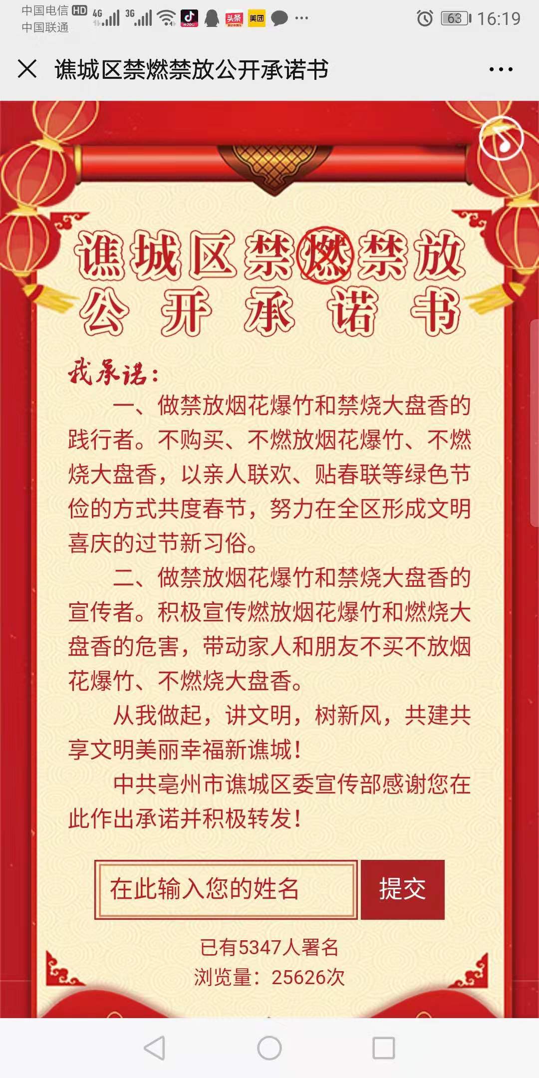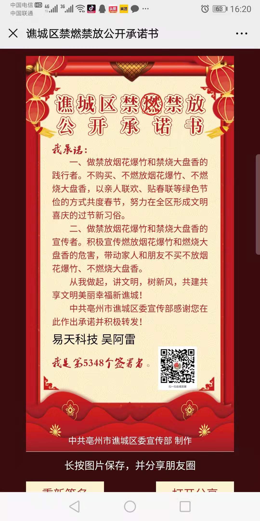 譙城區(qū)禁燃禁放公開承諾書我承諾:一、做禁放煙花爆竹和禁燒大盤香的踐行者。不購(gòu)買、不燃放煙花爆竹、不燃燒大盤香,以親人聯(lián)歡、貼春聯(lián)等綠色節(jié)儉的方式共度春節(jié),努力在全區(qū)形成文明喜慶的過節(jié)新習(xí)俗。二、做禁放煙花爆竹和禁燒大盤香的宣傳者。積極宣傳燃放煙花爆竹和燃燒大盤香的危害,帶動(dòng)家人和朋友不買不放煙花爆竹、不燃燒大盤香。從我做起,講文明,樹新風(fēng),共建共享文明美麗幸福新譙城!譙城區(qū)委宣傳部感謝您在此作出承諾并積極轉(zhuǎn)發(fā)??